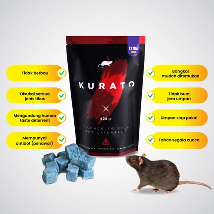 Keamanan :Memiliki zat pemuntah (Human Taste Deterrent) yang tidak disukai selain tikus, serta memiliki penawar (antidot) , sehingga Kurato tidak akan membahayakan manusia dan hewan peliharaan.